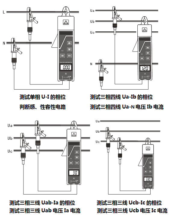 在線測試380/220伏電力系統中的相位、電壓、電流、漏電流、頻率、相序等,判斷感性、容性電路,非常適合于排線密集的場所及二次計量單位 |