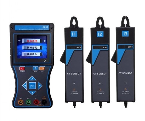 S230D 三相智能相位伏安表 是一款專為現場測試的多功能智能儀表,由 主機 、 電流鉗 (3 把 ) 、 測試線 (4 條 ) 等組成。主機采用 3.5 寸真彩液晶屏,圖形菜單界面顯示,向量圖指示,一目了然。選用大口徑電流鉗能測試 1000A 電流。儀表可以在被測回路不開路的情況下,同時測量三相交流電壓、電流、電壓間相位、電流間相位、電壓電流間相位、頻率、相序、有功功率、無功功率、視在功率、功率因數、電流矢量和,判別變壓器接線組別、感性、容性電路,測試二次回路和母差保護系統,讀出差動保護各組CT之間的相位關系,檢查電度表的接線正確與否,檢修線路設備等,為用電檢查人員提供一種安全、準確、便捷的智能儀表。適用于電力、石油化工、冶金、鐵路、氣象、工礦企業、科研院校、計量部門等。尤其適用于大功率三相電機、電能計費系統及繼電保護系統的電參數測試。