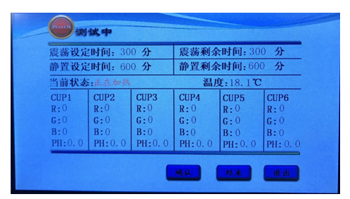 啟動后進入測試界面(圖3),自動完成加熱、震蕩、靜止、試驗、排液、打印數據等試驗過程,在此界面內可隨時結束試驗。