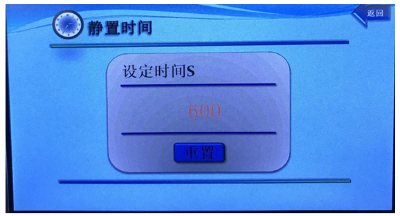 靜止時間設定界面(圖6),設定所需正當時間,默認600S。設定好后,按返回鍵自動保存所設定時間。