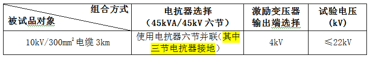 1、10kV/300mm2電纜3km的交流耐壓試驗,電容量≤1.1265uF,試驗頻率30-300Hz,試驗電壓22kV,試驗時間5min。