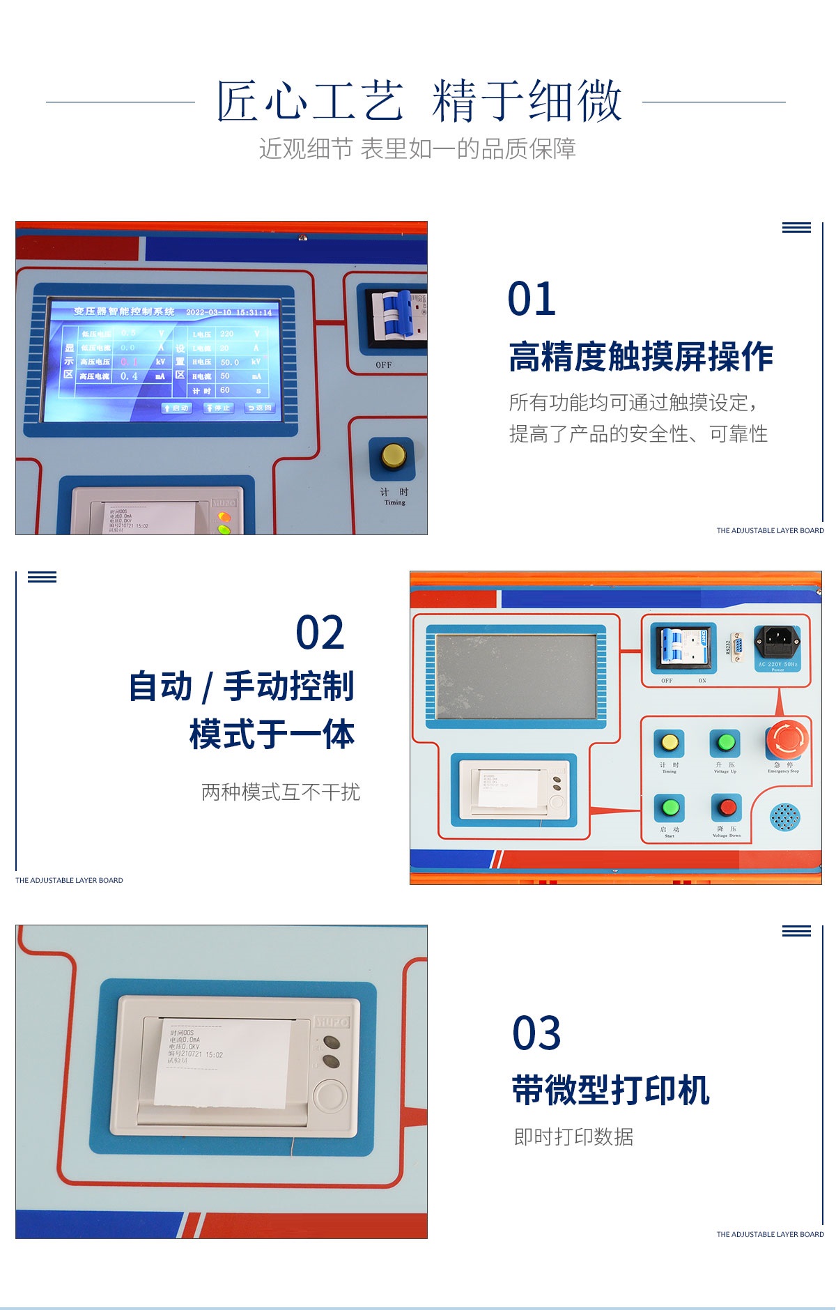 智能型充氣式工頻耐壓試驗裝置是根據國家新電力行業標準而設計的、性能先進的耐壓試驗設備,用于對各種電器產品、電氣元件、絕緣材料等進行規定電壓下的絕緣強度試驗,以考核產品的絕緣水平,發現被試品的絕緣缺陷,衡量過電壓的能力。,采用高分辨率 7 英寸高亮度全彩 PLC 觸摸顯示屏(分辨率 800×480),電壓、電流、時間、狀態信息及提示信息等全部同屏顯示,讀數清晰、直觀。