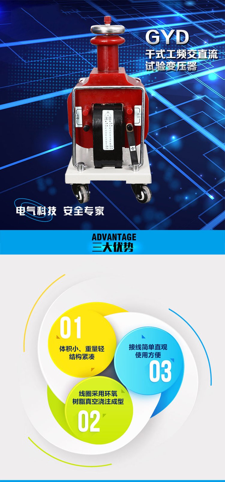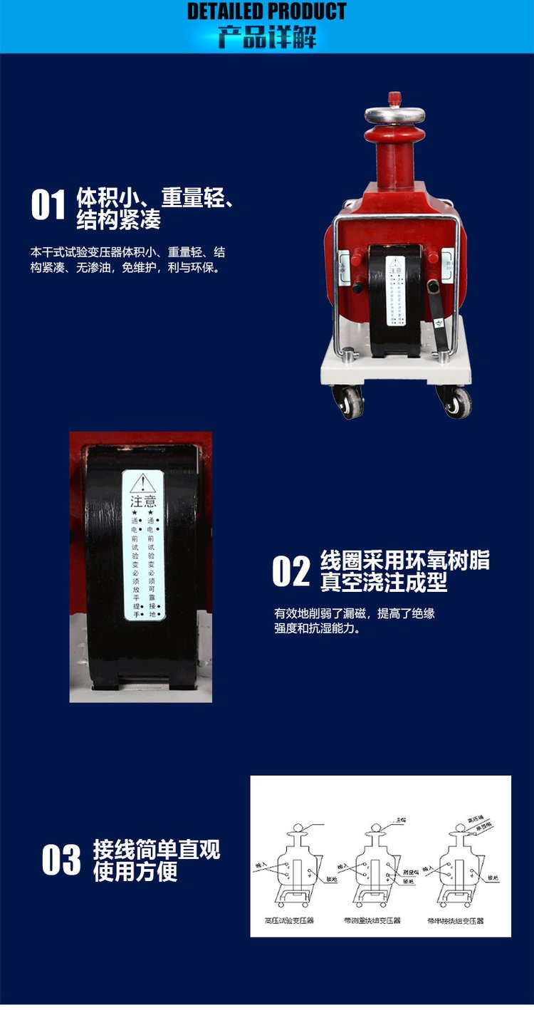 1、干式工頻交/直流試驗變壓器體積小、重量輕、結構緊湊、無滲油,免維護,利與環保。