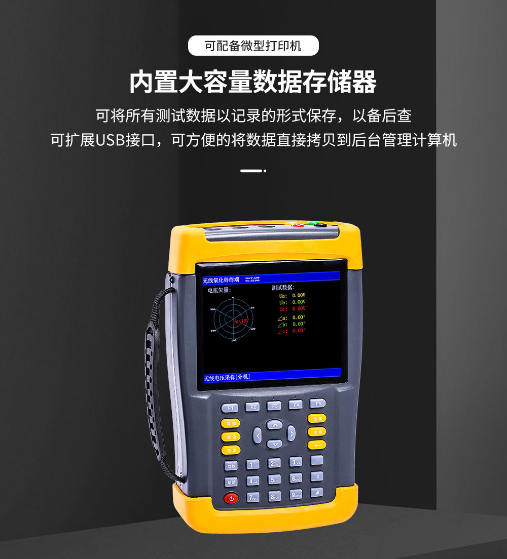氧化鋅避雷器是用來保護(hù)電力系統(tǒng)中各種電器設(shè)備免受過電壓損壞的電器產(chǎn)品,具有良好保護(hù)性能。為了檢驗氧化鋅避雷器的性能是否正常,我們適時開發(fā)了氧化鋅避雷器測試儀,這是一種用于現(xiàn)場和實驗室檢測避雷器各項相關(guān)電氣參數(shù)的專用儀器,廣泛應(yīng)用于氧化鋅避雷器的現(xiàn)場在線監(jiān)測(帶電測試)和實驗室(停電檢修)的測試中。符合中華人民共和國電力行業(yè)標(biāo)準(zhǔn)《DL474.5—92現(xiàn)場絕緣試驗實施導(dǎo)則—避雷器試驗》的要求。本儀器采用了高速微電腦控制的高精度采樣、處理電路,先進(jìn)的傅立葉諧波分析技術(shù),確保數(shù)據(jù)的可靠性。可測量氧化鋅避雷器在工頻電壓下的全電流、阻性電流、三次諧波電流、五次諧波電流、七次諧波電流、一次電壓、有功功率及電壓與電流的相位差角等。以判斷MOA絕緣受潮和閥片老化程度。電壓測量信號無線傳輸,避免了因避雷器與PT距離遠(yuǎn)而需要鋪設(shè)長距離電壓測量線的麻煩。設(shè)備采用大屏幕彩色液晶屏顯示,全漢字菜單提示操作及打印輸出。使人機(jī)交換功能更強(qiáng)。本儀器具有接線簡單、測量精度高、可靠性強(qiáng)等特點(diǎn)。