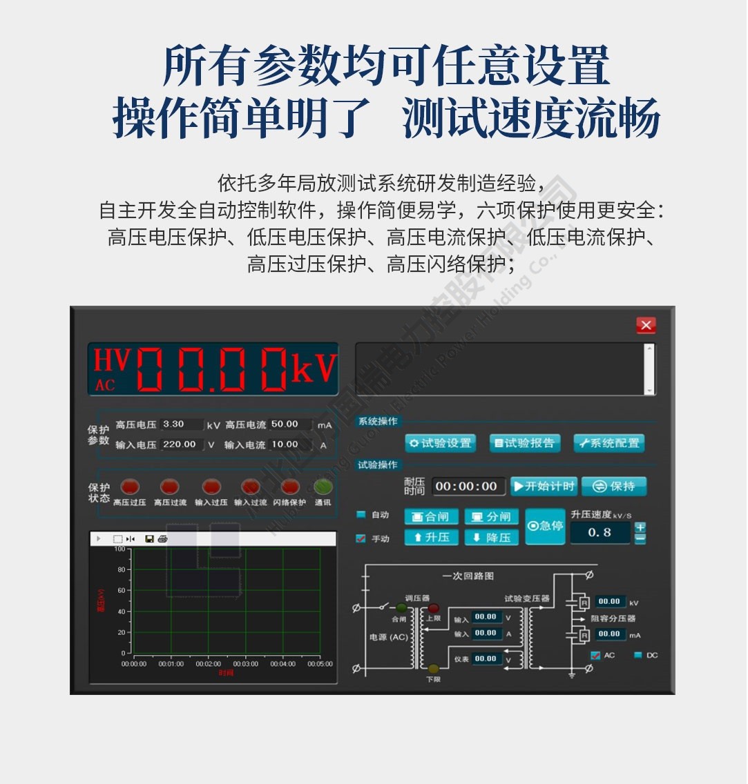 6、所有測試參數(shù)可提前進行設(shè)置,能達到高壓電壓放電擊穿電壓準確記憶、儲存、復(fù)位一系列功能;自動掃描時間設(shè)定,自動存儲電老化過程中的時間、電壓、電流等詳細記錄,方便用戶查看;