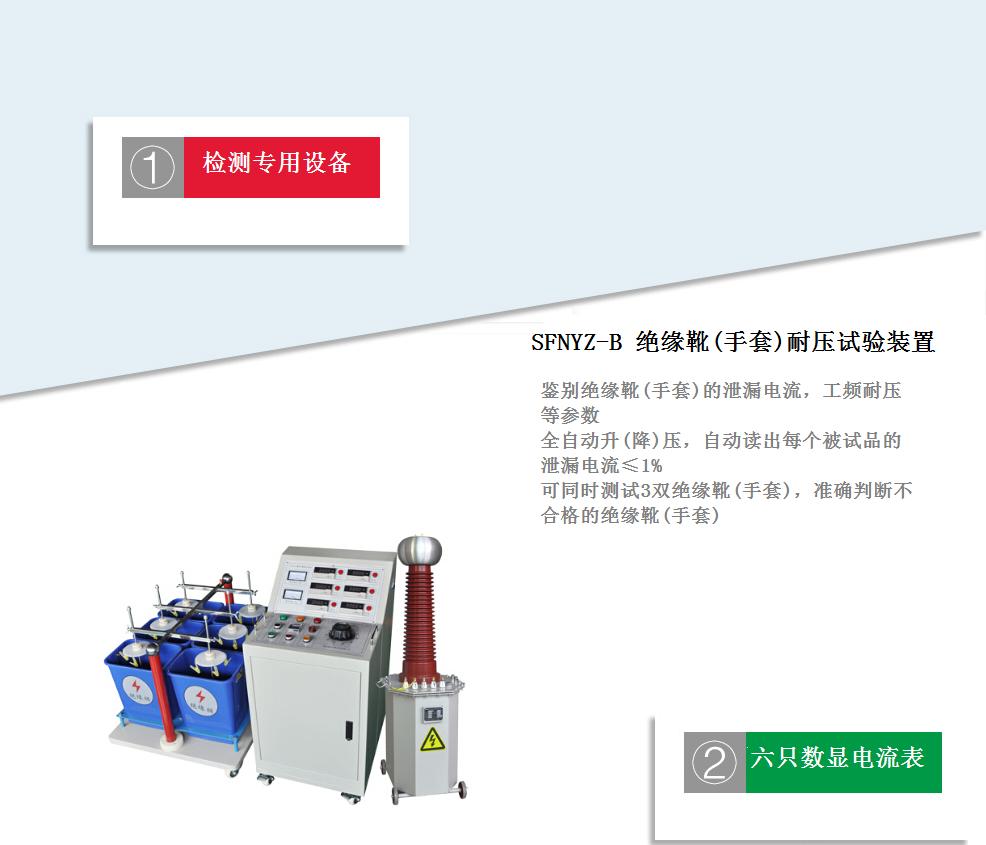 絕緣靴(手套)耐壓試驗裝置是我公司根據絕緣靴(手套)的試驗規程,并遵從廣大用戶意見而設計生產的。該產品采用全自動升(降)壓,自動讀出每個被試品的泄漏電流,整個過程全自動完成,自動打印試驗數據,有效的解決了過去不規則的測試方式,從而簡化了測試手續,提高了測試速度。更可靠地鑒別絕緣靴(手套)的泄漏電流,工頻耐壓等參數。保障了試驗工作者的安全,是理想的絕緣靴(手套)專用設備。其主要特點:可同時測試3雙絕緣靴(手套),并可讀取每只的泄漏電流,準確判斷不合格的絕緣靴(手套);結構底部裝配腳輪,可隨意移動。
