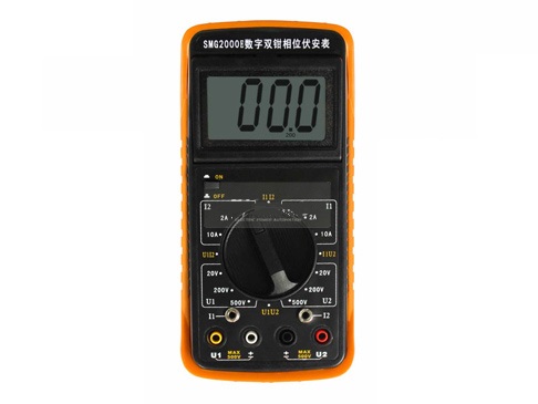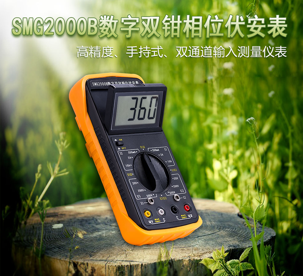 SFMG2000B數字雙鉗相位伏安表是專為現場測量電壓、電流及相位而設計的一種高精度、低價位、便攜手持式、雙通道輸入測量儀器。用該表可以很方便地在現場測量U-U、I-I及U-I之間的相位,判別感性、容性電路及三相電壓的相序,檢測變壓器的接線組別,測試二次回路和母差保護系統,讀出差動保護各組CT之間的相位關系,檢查電度表的接線正確與否等。采用鉗形電流互感器轉換方式輸入被測電流,因而測量時無需斷開被測線路。測量U1-U2之間相位時,兩輸入回路完全絕緣隔離,因此完全避免了可能出現的誤接線造成的被測線路短路、以致燒毀測量儀表。顯示器采用了高反差液晶顯示屏,屏幕角度可自由轉換約70°,以獲得最佳視覺效果。