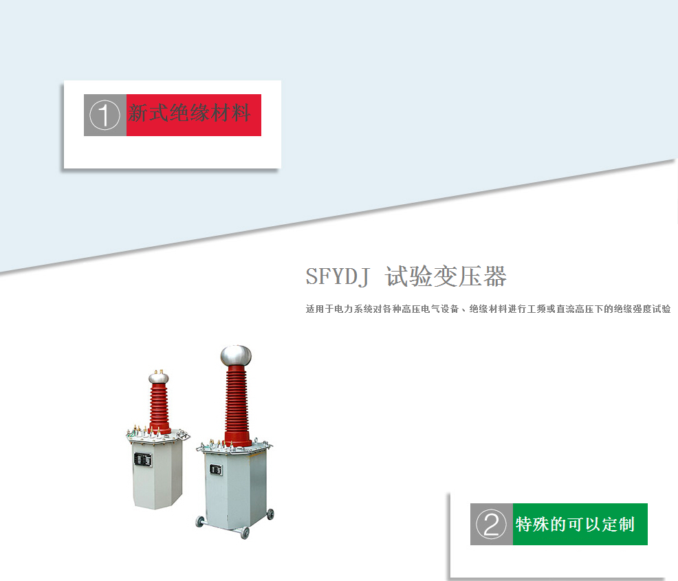 SFSB系列油浸式試驗變壓器,是根據(jù)《試驗變壓器》標準在原同類產(chǎn)品基礎(chǔ)上經(jīng)過大量改進后,研制生產(chǎn)的系列試驗變壓器,該產(chǎn)品遵照DL/T848.2-2004《高壓試驗裝置通用技術(shù)條件-第2部分:工頻高壓試驗裝置》,研制生產(chǎn)的一種新型產(chǎn)品。本系列產(chǎn)品具有體積小、重量輕、結(jié)構(gòu)緊湊、功能齊全、通用性強和使用方便等特點。特別適用于電力系統(tǒng)、工礦企業(yè)、科研部門等對各種高壓電氣設(shè)備、電器元件、絕緣材料進行工頻或直流高壓下的絕緣強度試驗。是高壓試驗中必不可少的重要設(shè)備。