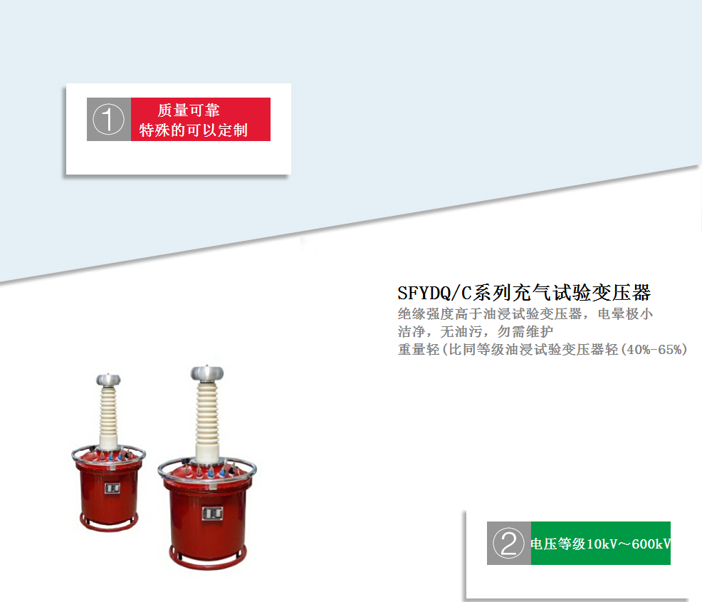 充氣式交流試驗變壓器是電力設備檢測及預防性試驗所必備的試驗設備。隨著我國電力工業的發展,對試驗變壓器的電壓等級要求也越來越高,而傳統的油浸式試驗變壓器,無論在體積上和重量上還是在性能上都越來越不能滿足現場工作的要求。