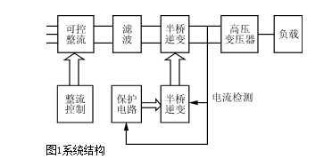 用于調節輸出功率的方法有可控整流調壓調功、斬波調功、移相調功或PWM調功,本文設計的電源采用三相相控整流技術,通過相控整流實現輸出功率的調節。雖然此種方法在深控下有輸出功率因數低的缺點。但其控制方法成熟,可靠性高,對于絕大部分工作在滿功率輸出(α=0)情況下,不失為一種較好的選擇。逆變器為半橋式電路,這是由于全橋逆變電路中輸出電壓中含有直流分量,在設計高頻高壓升壓器時要考慮到直流磁通可能導致磁通飽和的問題。同時會增加磁芯損耗,增大變壓器設計難度,雖然可以在輸出中串聯隔直電容避免這個問題,但增加了成本和復雜性。