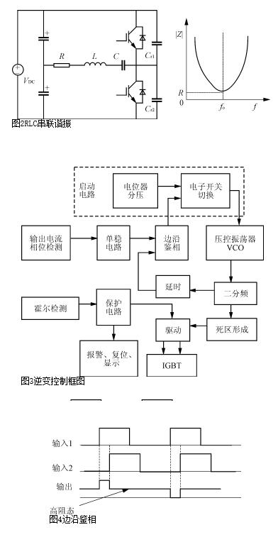 鎖相環一個明顯的缺點是啟動的時候失鎖率比較高,因此,逆變控制采用他-自激轉換工作方式。正常運行時為自激工作,電流相位信號取自電流互感器,經過零比較和單穩電路,送至4046。電壓相位信號直接取自二分頻器的輸出,如圖3所示。經鎖相環和分頻器后,形成兩組與正負半波對應的方波。該方波經死區形成和驅動器產生IGBT的驅動信號。死區環節的作用在于防止逆變器上、下橋臂同時導通。啟動時,取他激頻率調節電位器上的電壓直接作為4046內部壓控振蕩的控制信號,進行他激啟動。當輸出電流達到一定值后,比較器輸出信號跳變,使電子開關動作,切斷振蕩器信號;同時將電流信號和電壓信號送4046內部鑒相器,使系統進入自激運行狀態。電壓信號在進入鎖相環之前,經過時滯補償,目的在于補償脈沖傳輸過程中的時間滯后。