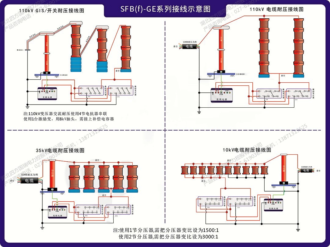 35kV 電纜交流耐壓裝置SFB(f)-GE系列主要針對110kV/300mm2電纜0.5km,35kV/300mm2電纜2km、10kV/300mm2電纜5km、110kV/63000kVA主變中性點、110kV開關,35kV開關、GIS的交流耐壓試驗設計制造。具有較寬的適用范圍,是地、市、縣級高壓試驗部門及電力安裝、修試工程單位理想的耐壓設備。
