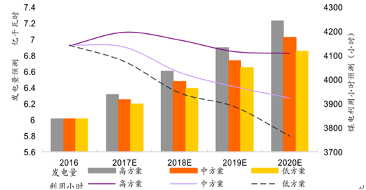 按照我國第十三個五年計劃的規劃,到2020年,我國的煤電的發電總量將會是11億千瓦,其占全社會的總發電量將進一步縮減4%左右,2017~2020發電量及發電小時預測