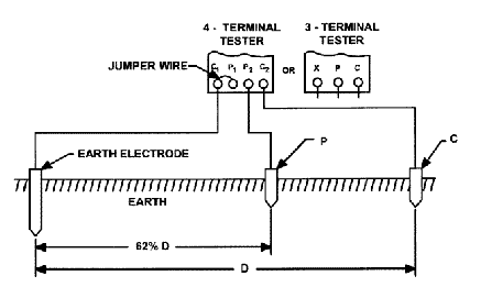 使用四端子測試儀,儀器上的P1和C1端子跳線并連接到被測接地電極,同時C2參考桿盡可能遠離被測電極直接驅入接地。
