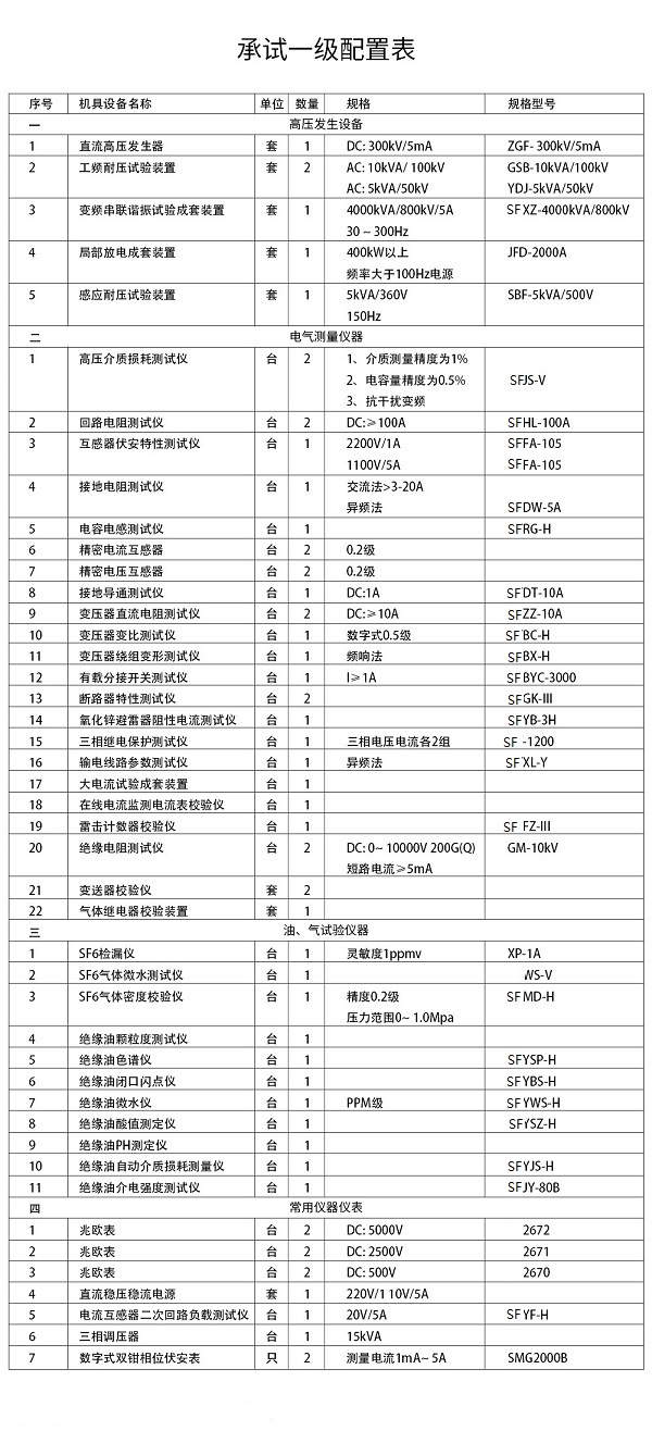 電力一級承裝承修承試資質設施許可證所需設備選型如下: