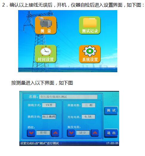 1.拆去被測變壓器的三側(cè)引線,將非測試端(通常為中壓側(cè)、低壓側(cè))分別三相短路接地。將測試鉗黃、綠、紅、黑依次夾到被測變壓器的調(diào)壓側(cè)(通常為高壓側(cè))套管的A、B、C三相和中性點上,然后將測試線另一端黃、綠、紅、黑線分別接在儀器的A、B、C、N端子上。更多技術(shù)介紹 可訪問湖北四方國瑞電力控股有限公司